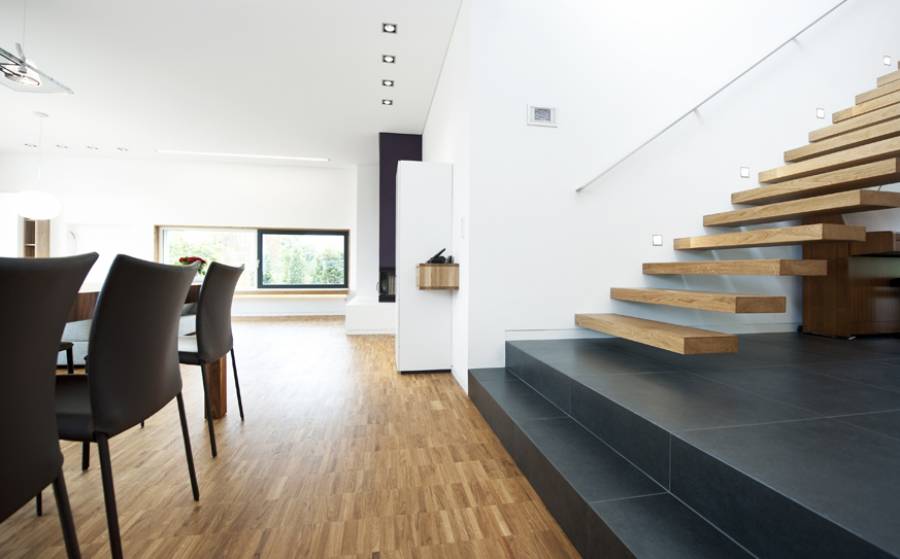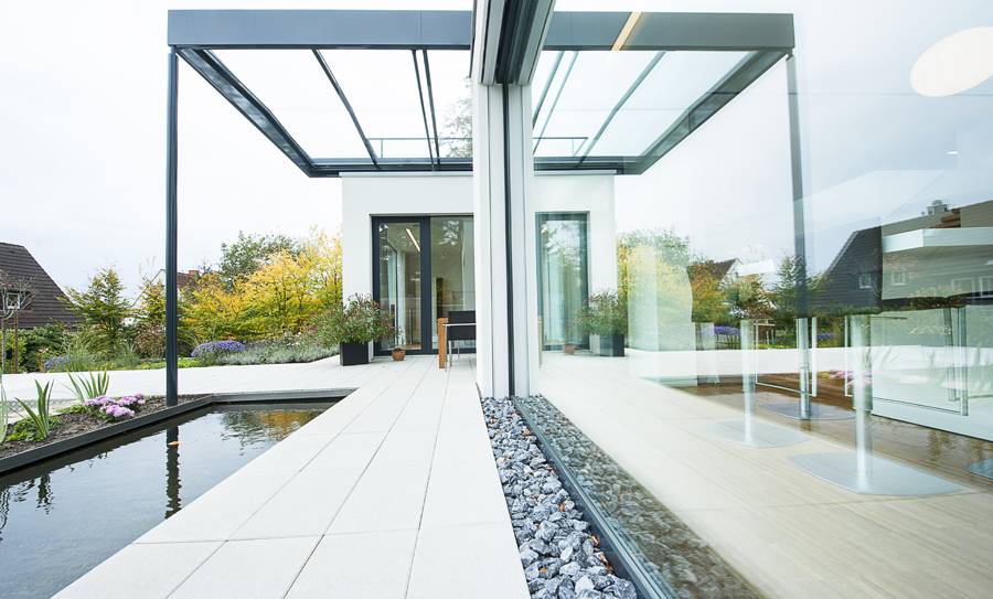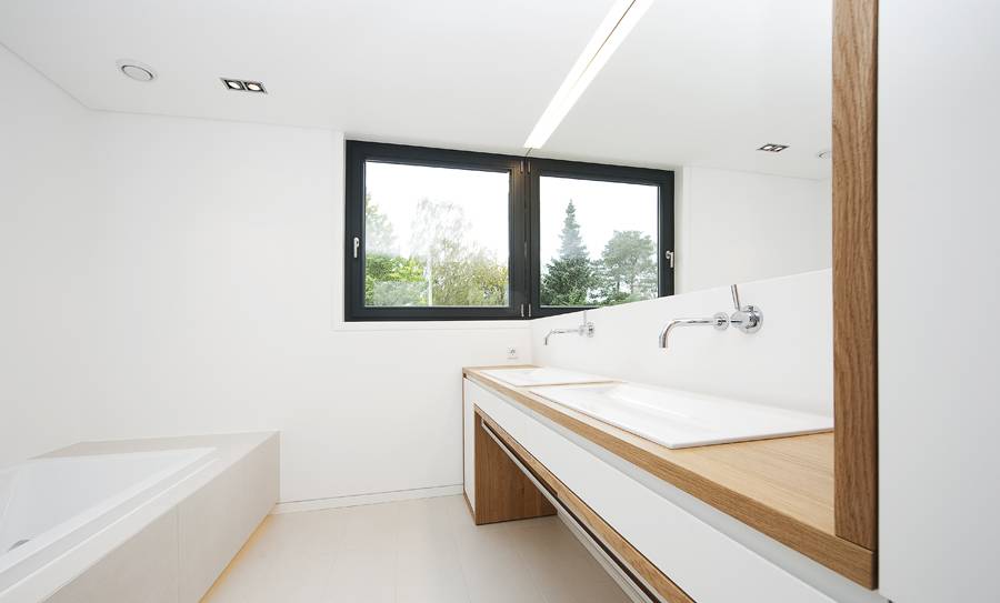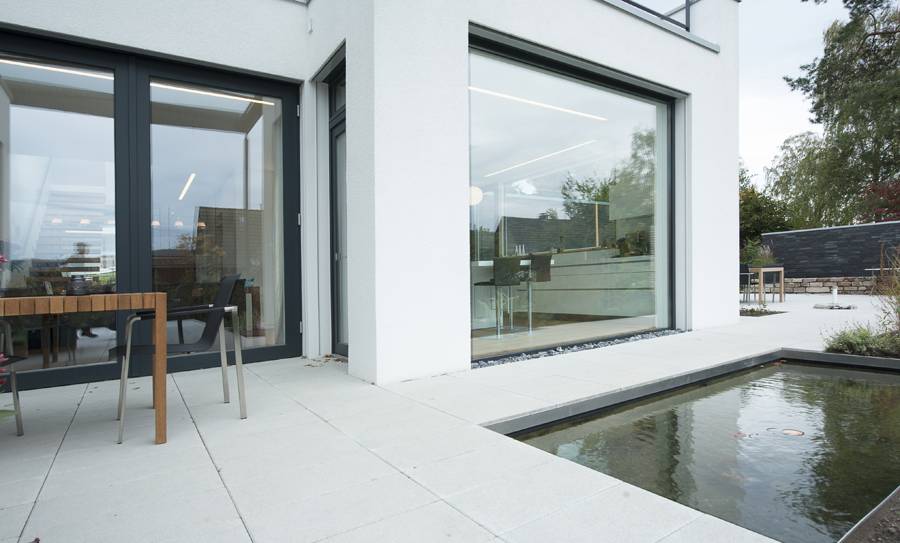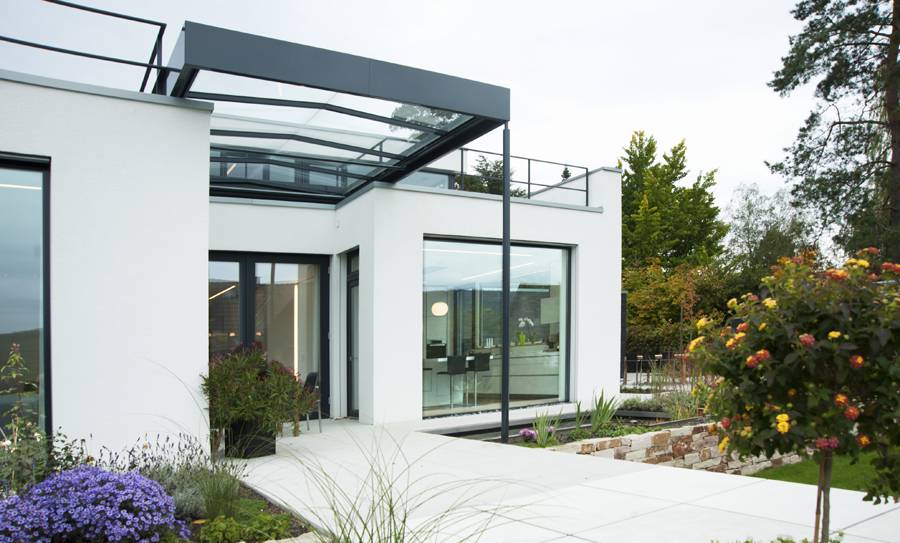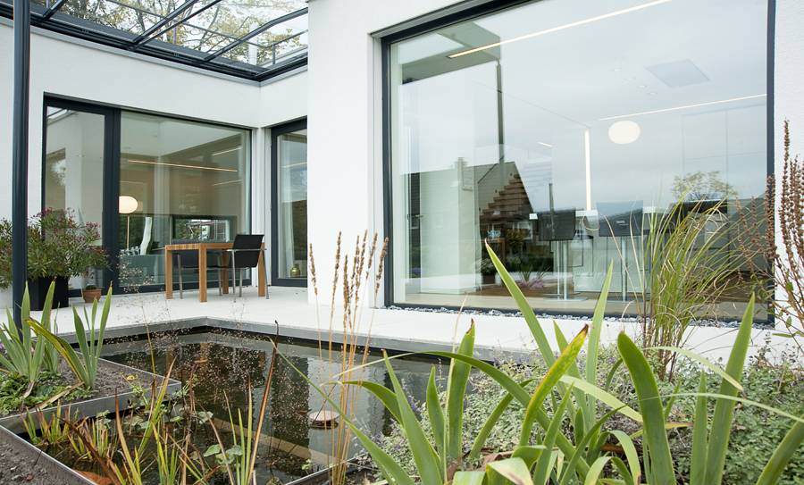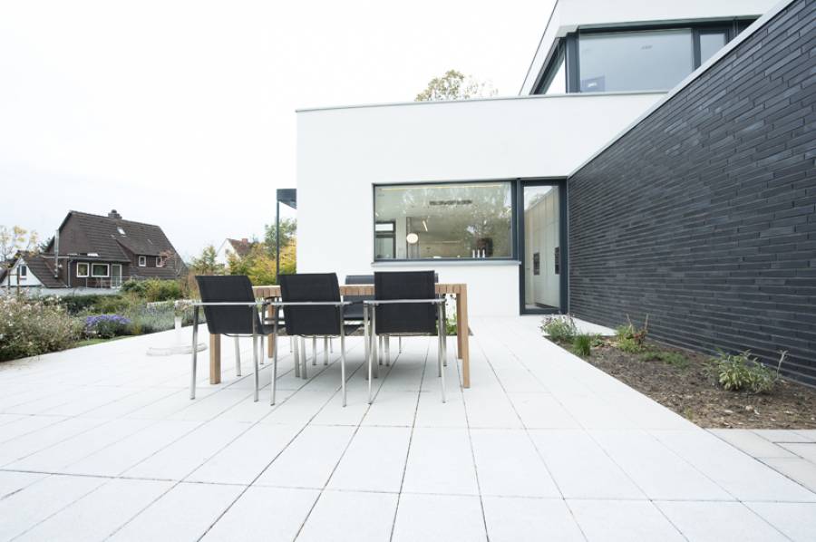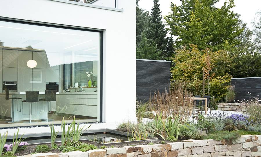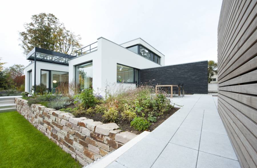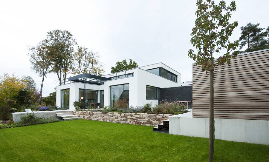 Moderner Solitär mit Blick auf Hermanns-Denkmal und Teutoburger Wald. Auf dem Südhanggrundstück in zweiter Reihe orientieren sich alle Räume Richtung Landschaft. Innere Achsbezüge der Grundrisse setzten sich konsequent in den Garten fort. Große Glasflächen lassen dabei Außen- und Innenräume verschmelzen. Erhöhter baulicher Wärmeschutz., Dreischeibenverglasung, moderen Haustechnik /Bussystem, Lüftungsanlage Wärmerückgewinnung) sind verantwortlich für Komfort und Wirtschaftlichkeit.