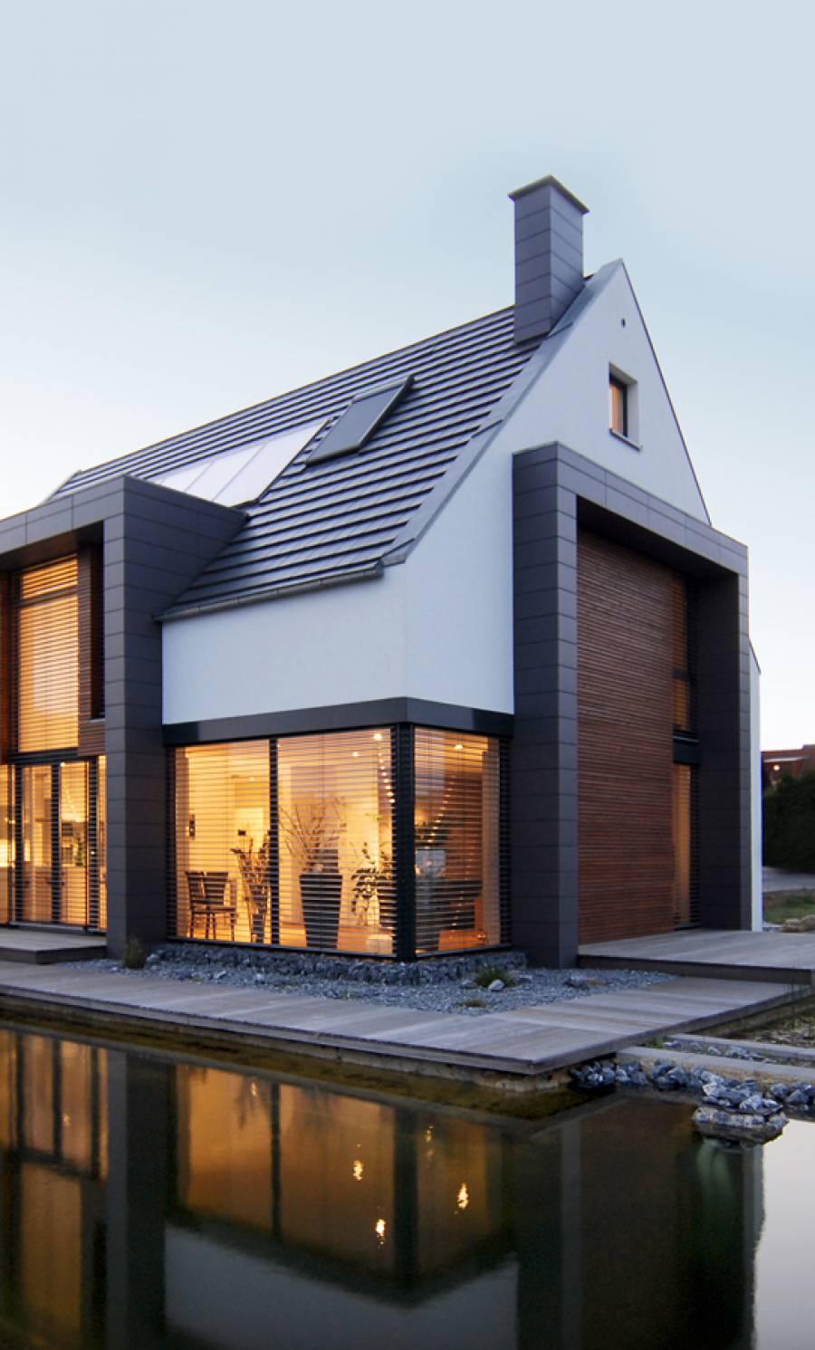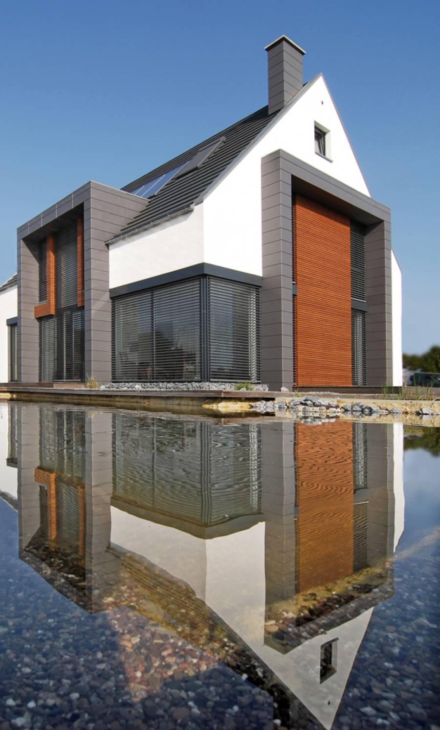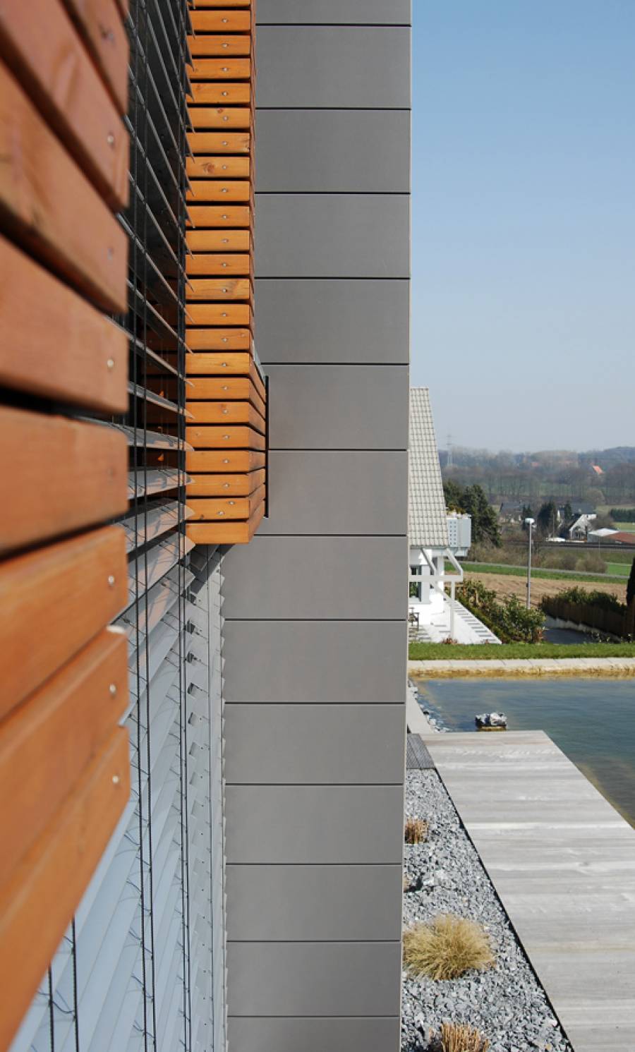 Für eine 4-köpfige Familie entstand dieses Holzrahmenbau-Haus. Es liegt auf einem Südhang-Grundstück eines klassischen Neubaugebietes zwischen Bielefeld und Herford. Besonderheiten des Ortes waren neben der optimalen Besonnung des Grundstücks die sehr reizvolle Fernsicht über Teutoburger Wald und Ravensberger Hügelland.